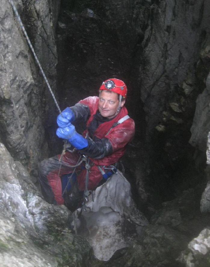 ![]() David Rose (Expedition Leader) on E23 entrance pitch. Photo by Martin Hoff |