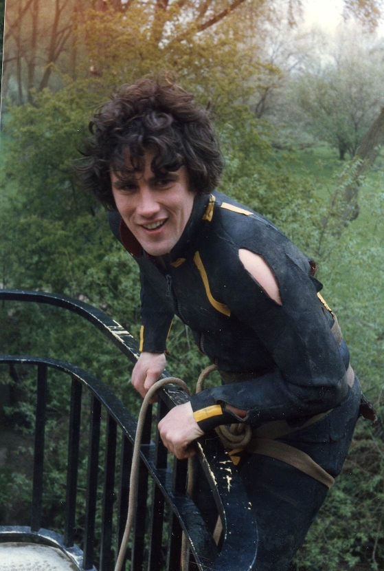 Steve Roberts about to prove the shock absorbency of caver, harness and ancient PMI rope. "Rainbow bridge", University parks, Oxford.